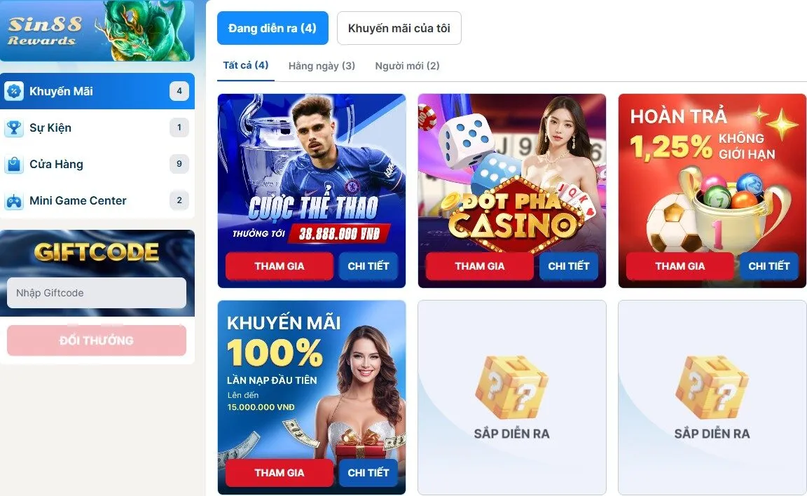 Các chương trình khuyến mãi được cập nhật liên tục, giúp người chơi luôn có cơ hội gia tăng lợi nhuận và tận hưởng trọn vẹn niềm vui tại SIN88.
