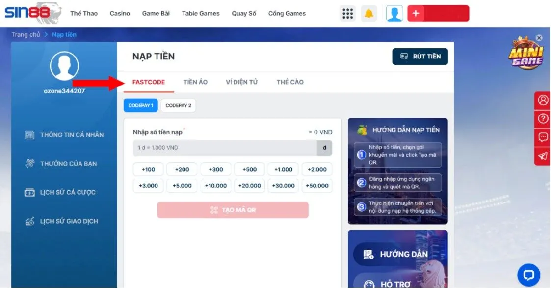 Sin88 mang đến phương thức nạp tiền qua Paycode (Fastcode) nhanh chóng và an toàn, giúp người chơi hoàn tất giao dịch chỉ trong vài bước đơn giản.