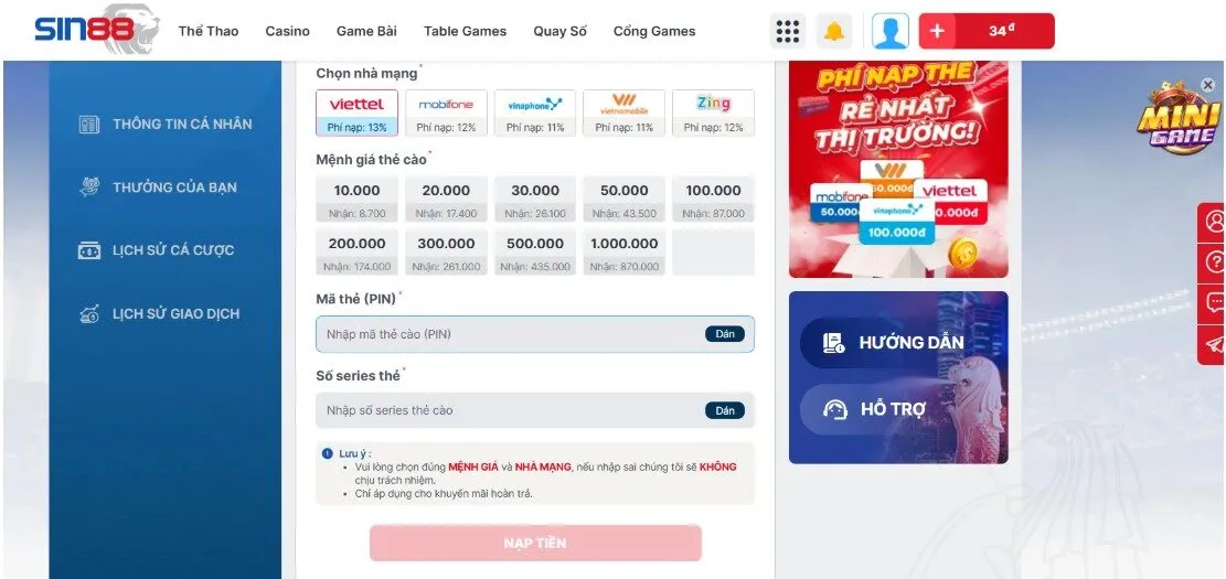 Nhằm mang lại sự linh hoạt tối đa, SIN88 hỗ trợ nạp tiền bằng thẻ cào của các nhà mạng: Viettel, Vinaphone, Mobifone, Vietnamobile và Zing. Phí gạch thẻ: Viettel 13%, Mobifone 12%, Vinaphone & Vietnamobile 11%, Zing 12%.