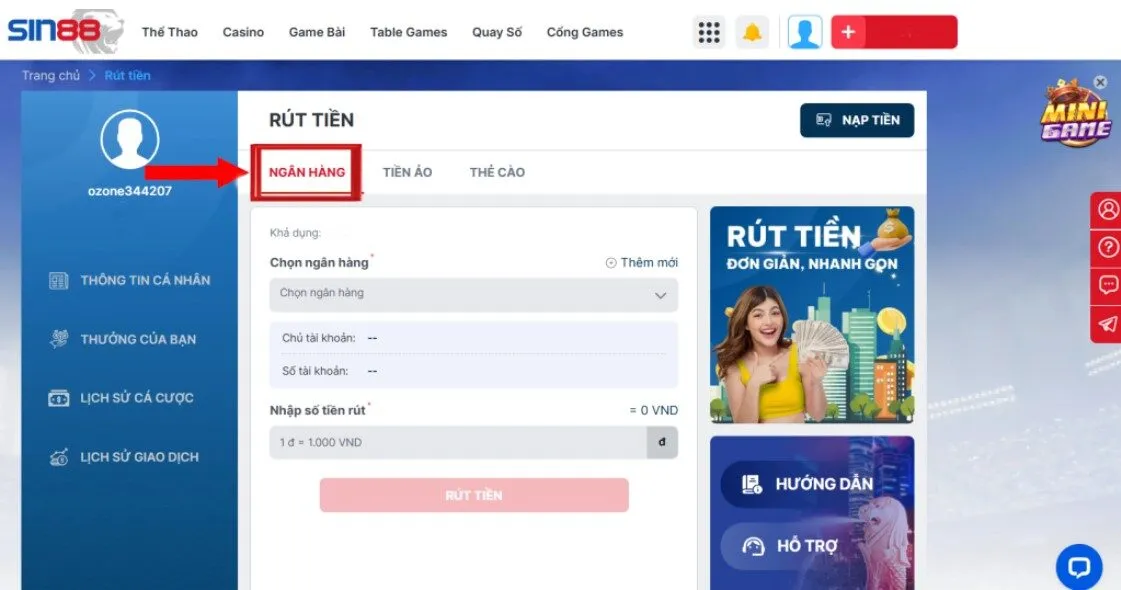 Nếu đã đăng ký Internet Banking, bạn có thể thực hiện giao dịch nạp – rút nhanh chóng ở bất kỳ đâu. Ngoài ra, SIN88 cũng hỗ trợ chuyển tiền liên ngân hàng, giúp người chơi thuận tiện dù không có tài khoản tại ngân hàng hỗ trợ trực tiếp.